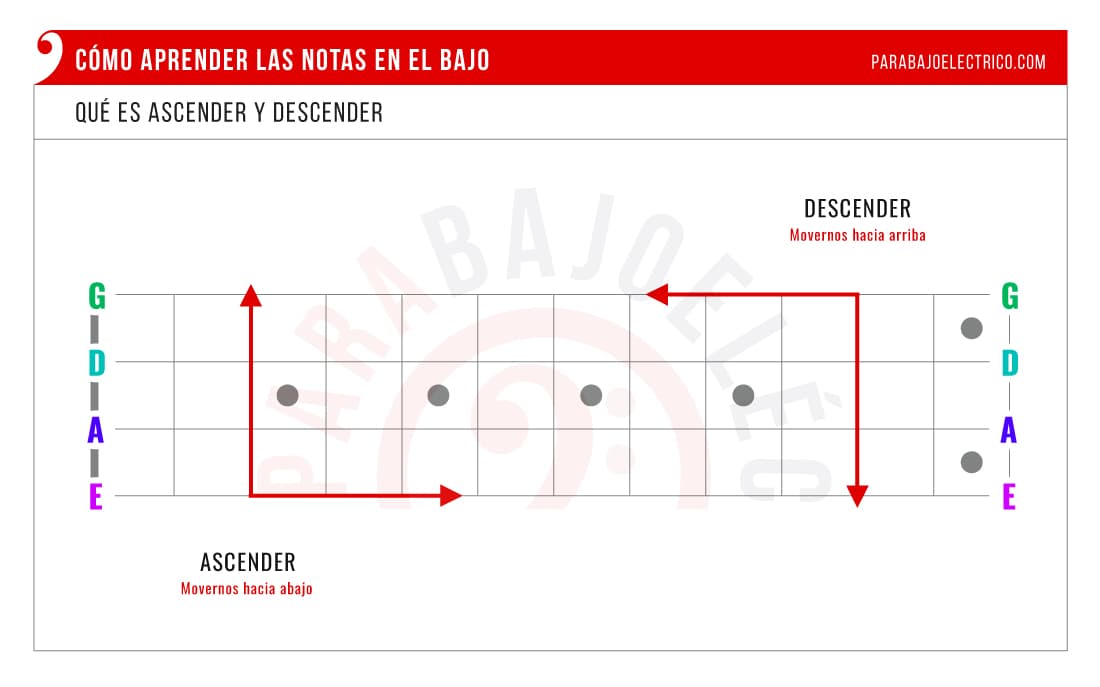 Las notas del bajo se disponen de forma secuencial a lo largo y ancho del diapasón, y siguen un orden de alturas (frecuencias).