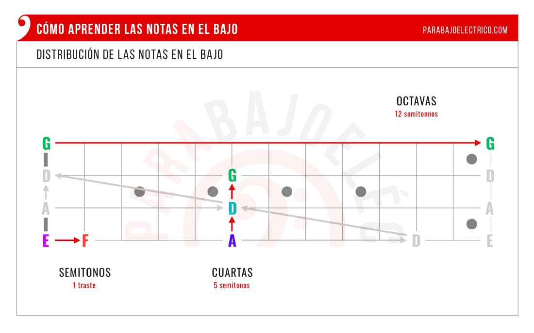De este modo, ten en cuenta 2 cosas que te ayudarán a simplificar el diapasón del Bajo.