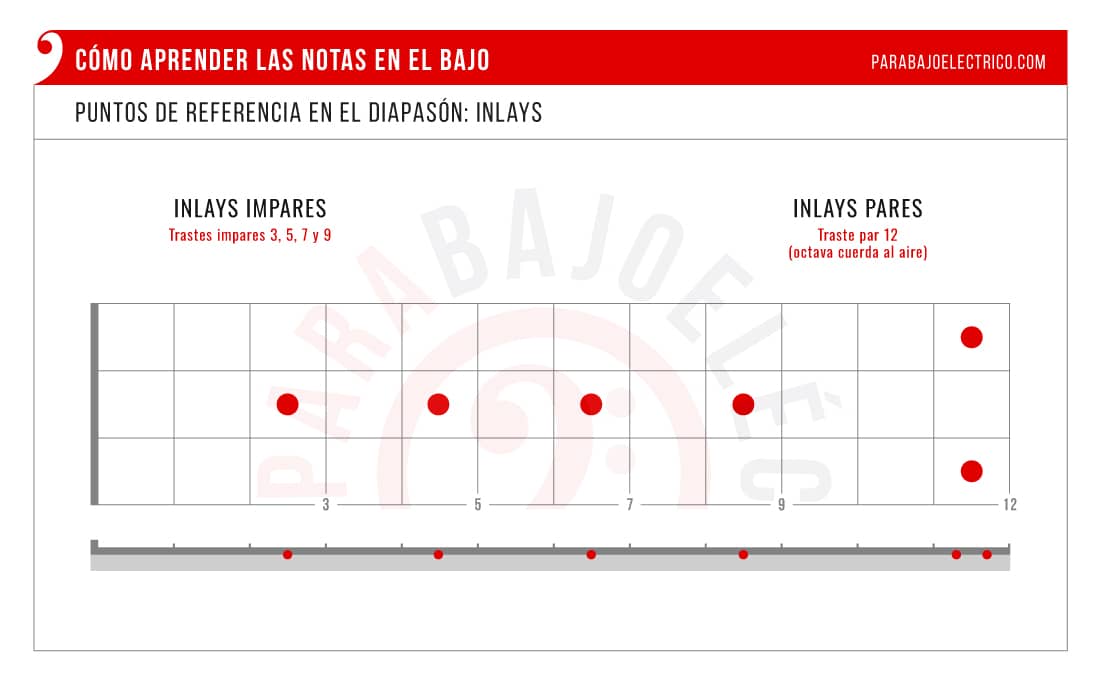 Son lo que llamamos «Inlays» (te hablé de ellos cuando te enseñé todos los componentes de un Bajo), y sean como sean (por lo general puntos), siempre marcan los mismos trastes: