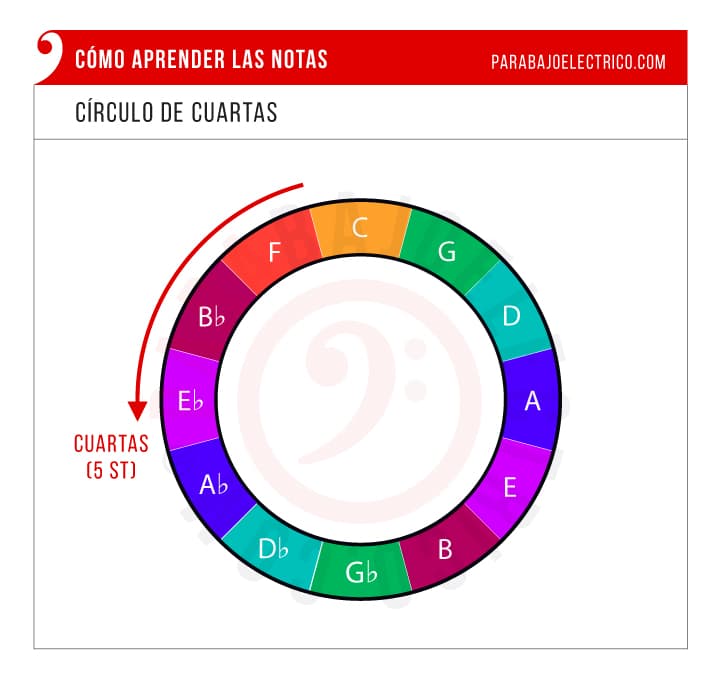 Como ves en la imagen, se trata de un círculo con las 12 notas cromáticas en el que, si lees en sentido contrario a las agujas del reloj, todas están separadas por 5 semitonos.