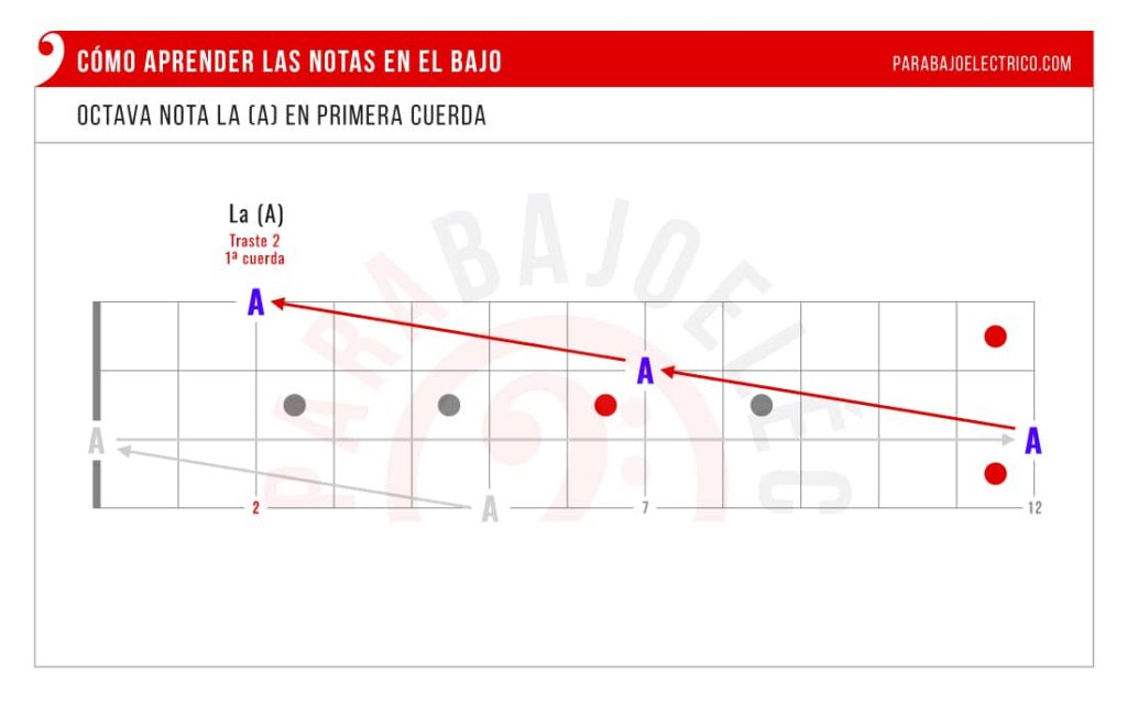 De forma horizontal (misma cuerda), las notas se agrupan en octavas (11 trastes), y por eso a partir del traste 12 se repiten en el mismo orden más agudas.