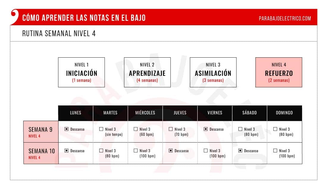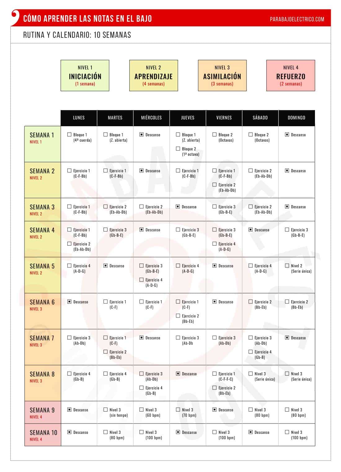 Por ejemplo, a continuación tienes la rutina y calendario que mejor creo que funciona con mi metodología para aprender las notas en el Bajo eléctrico.