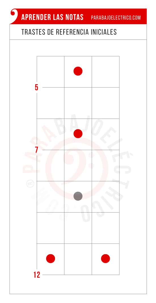 Por una parte, los trastes con 2 círculos (12) son el inicio de una nueva octava (ya sabes, misma nota de afinación de la cuerda al aire, pero más aguda).