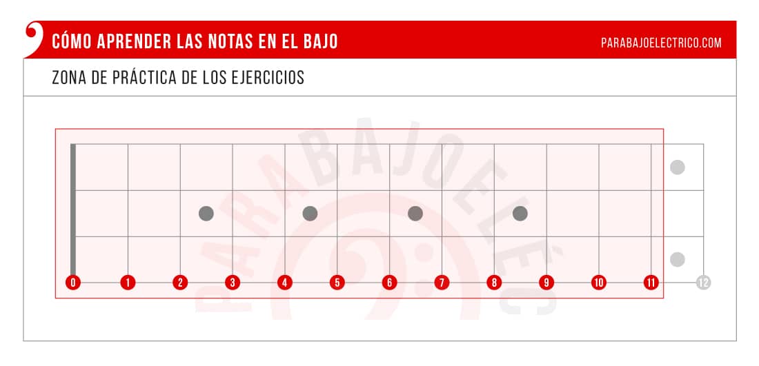 La primera que, como ya te he adelantado, todos los ejercicios para aprender las notas en el Bajo los vamos a realizar en la primera región del diapasón (la delimitada por el traste 12).