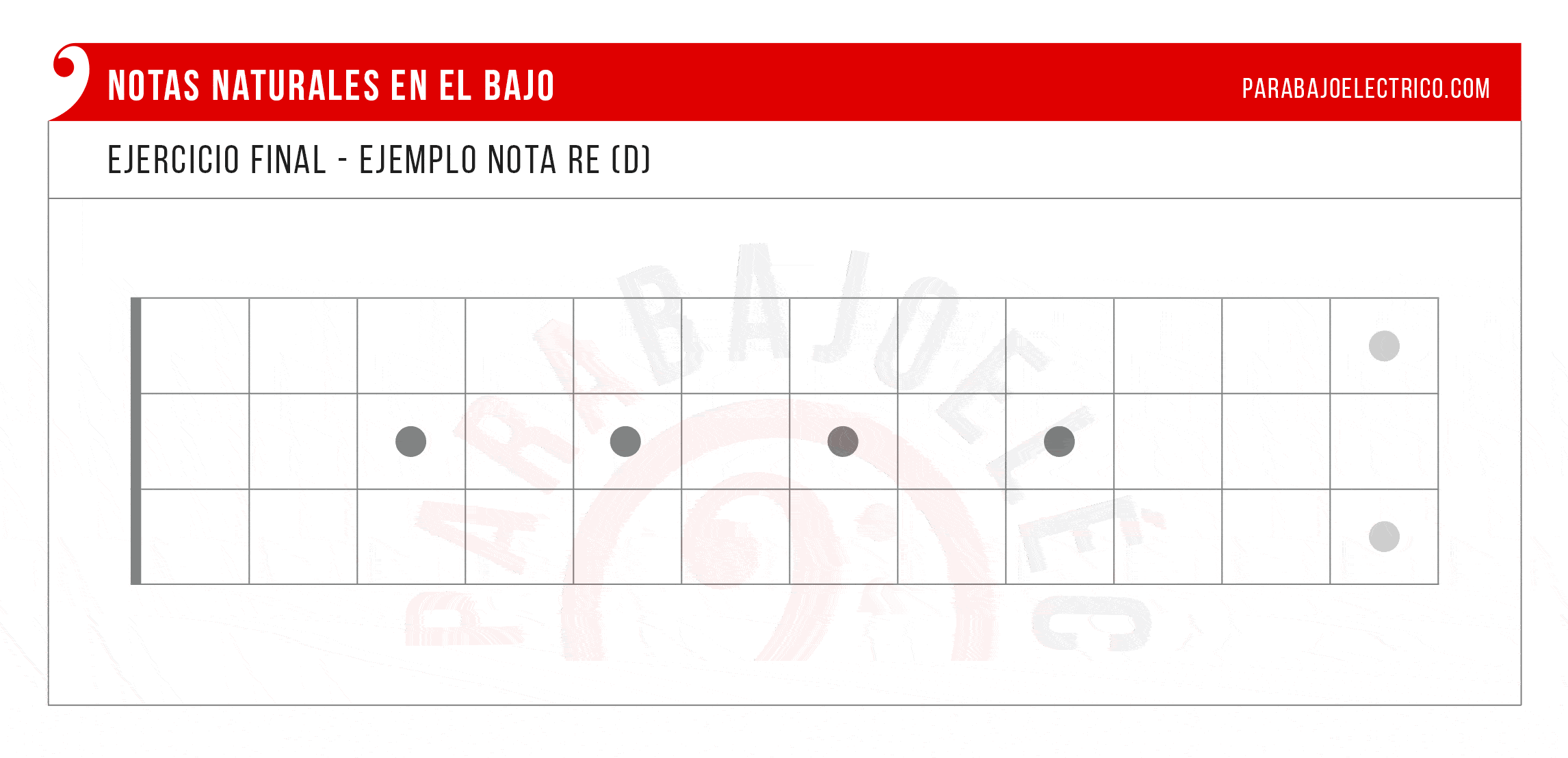 Bajista, ya deberías ser capaz de resolverlo a través de varias formas distintas. Por ejemplo, siguiendo el orden normal a partir del Re (D) en primera cuerda, o bien a partir de la octava de la primera octava de Mi (E) en tercera cuerda: