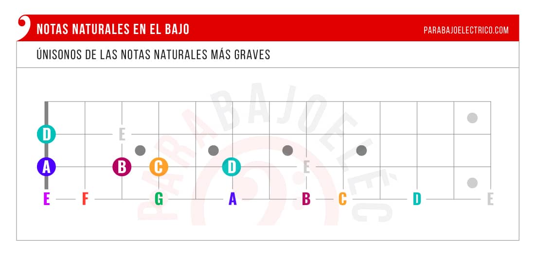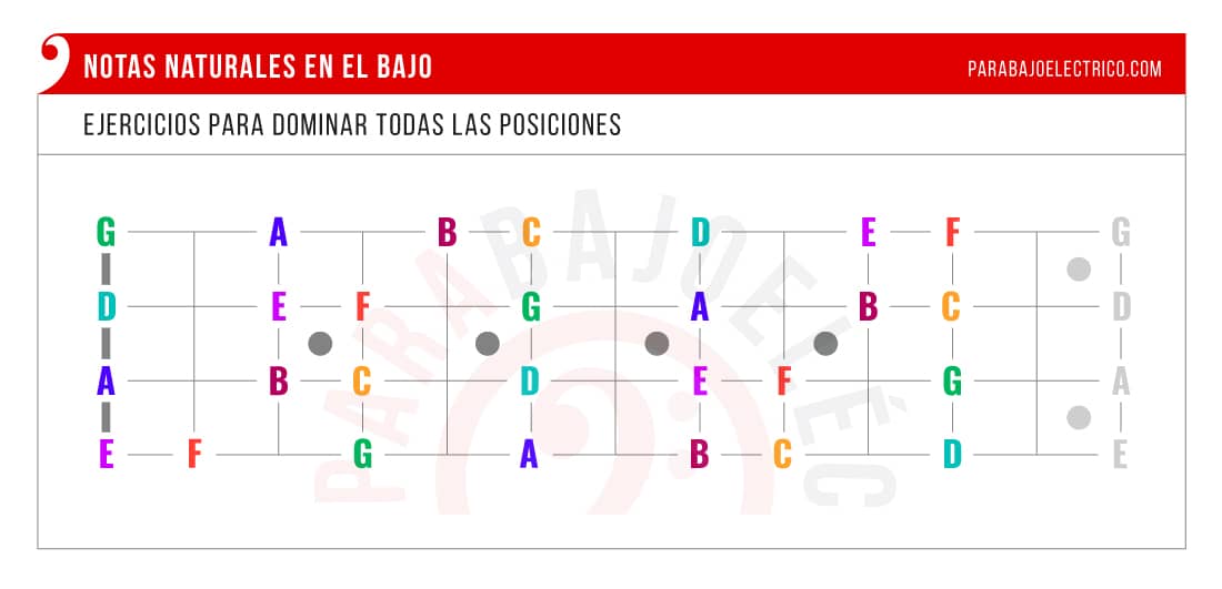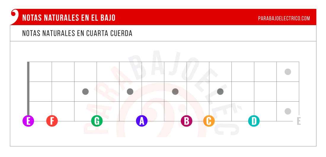 El primer ejercicio para aprender las notas naturales en el Bajo consiste en estudiar sus posiciones a lo largo de la cuarta cuerda.