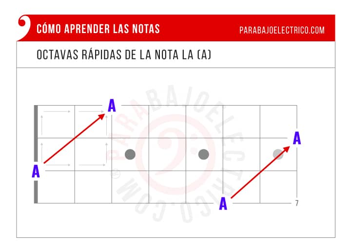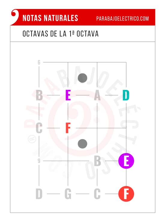Encontramos la primera octava de todas las notas ascendiendo 2 trastes y 2 cuerdas a partir de su posición inicial.