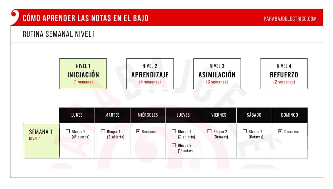 Si eres Bajista principiante, ten muy en cuenta trabajar cada ejercicio de forma individual (y en este orden), y siguiendo la rutina del plan de entrenamiento que te propongo para mi metodología de aprendizaje.