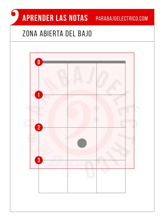 Como ves en la imagen, la delimito la Zona abierta del Bajo eléctrico entre el traste cero (cuerda al aire) y el traste 3 de todas las cuerdas.