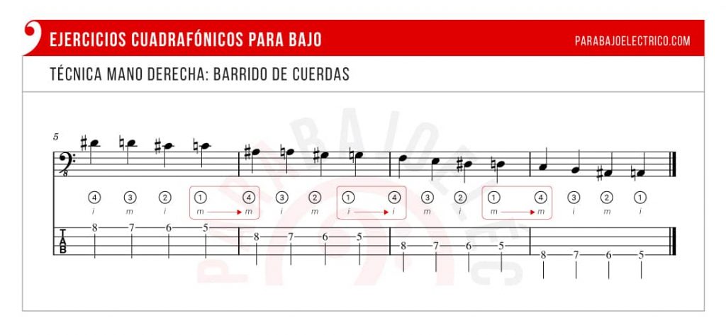 Para hacer los ejercicios cuadrafónicos en el Bajo es muy importante pulsar las cuerdas alternando los dedos índice (i) y medio (m) en todo momento.